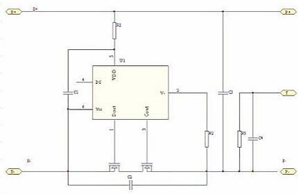 保護板有兩個核心部件:一塊保護IC,它是由精確的比較器來獲得可靠的保護參數;另外是MOSFET串在主充放電回路中擔當高速開關,執行保護動作。電路原理圖如下: