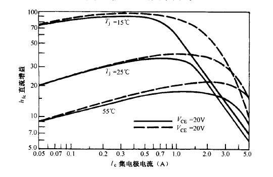 圖 9.13  雙極型晶體管的直流增益曲線 。雙極型晶體管的增益隨著輸出電流的增大而減小 ,而MOSFET 管不存在這種情況 ,MOSFET 管最大電流只受結點溫升的限制
