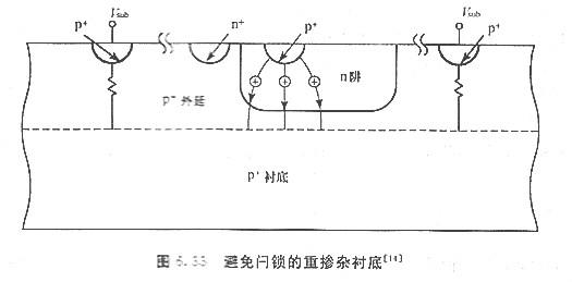 為避免發生閂鎖效應,必須減少寄生雙極型晶體管的電流增益,一種方法是使用金摻雜或中子輻射,以降低少數載流子的壽命,但此方法不易控制且也會導致漏電流的增加.深阱結構或高能量注入以形成倒退阱( retrograde well),可以提升基極雜質濃度,因而降低縱向雙極型晶體管的電流增益.在倒退阱結構中,阱摻雜濃度的峰值位于遠離表面的襯底中.另一種減少閂鎖效應的方法,是將器件制作于高摻雜襯底上的低摻雜外延層中,如圖6. 33所示.高摻雜襯底提供一個收集電流的高傳導路徑,這些電流隨后會由表面接點流出.