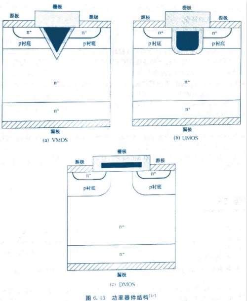 圖6.43為三個基本的功率MOSFET結(jié)構(gòu).與ULSI電路中的MOSFET器件不同的是,功率MOSFET采用源極與漏極分別在晶片上方與下方的垂直結(jié)構(gòu).垂直結(jié)構(gòu)有大的溝道寬度以及可降低柵極附近電場擁擠的優(yōu)點.這些特性在高功率的應(yīng)用上非常重要.