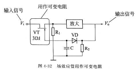 場效應管可以用作可變電阻。如圖4-32所示為自動電平控制電路,當輸入信號Ui增大導致u。增大時,由Uo經二極管VD負向整流后形成的柵極偏壓一UG的絕對值也增大,使場效應管VT的等效電阻增大,Ri與其的分壓比減小,使進入放大器的信號電壓減小,最終使Uo保持基本不變。