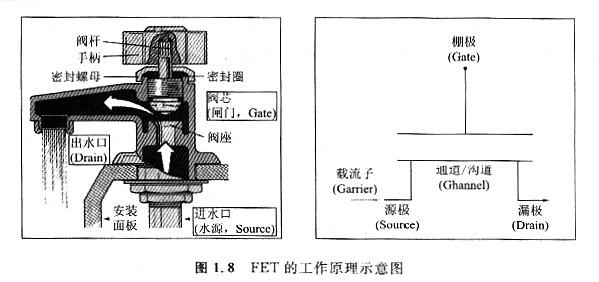 目前大致有兩種辦法,一種是用兩個(gè)相同的半導(dǎo)體構(gòu)建柵區(qū),這兩個(gè)柵區(qū)就像水龍頭的閥芯與閥座,所不同的是,閥座是固定的,而兩個(gè)柵區(qū)都是“挪動(dòng)”的,即兩個(gè)柵區(qū)同時(shí)控制導(dǎo)電通道的寬窄大小從而控制流過(guò)通道的電流的大小,控制辦法是應(yīng)用電場(chǎng)構(gòu)成根本不導(dǎo)電的“耗盡區(qū)”,功用構(gòu)造如圖1.9所示。這種構(gòu)造的FET就是JFET(Junction gate FET),由于溝道的不同,有N溝道JFET(NJFET)和P溝道JFET(PJFET)之分,其溝道分別為N型和P型半導(dǎo)體。N溝道JFET的構(gòu)造簡(jiǎn)圖如圖1.9所示,關(guān)于P溝道,只需求將N與P對(duì)調(diào)即可。
