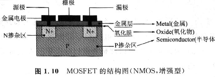 由于圖1. 10所示的這種構(gòu)造與JFET相比,主要的區(qū)別是金屬層、氧化膜和“摻雜”的半導(dǎo)體,MOSFET的名字大致就是這樣來(lái)的。與JFET 一樣,由于導(dǎo)電溝道的不同,MOSFET也有N河道MOSFFET( NMOS)和P溝道MOS-FET(PMOS)兩類,其溝道分別為N型和P型半導(dǎo)體,圖1.10是N溝道JFET。關(guān)于P溝道,只需求將N與P對(duì)調(diào)即可。另外,PMOS和NMOS -般用于稱謂集成電路中的器件單元,在普通分立元件的電路中很少這樣稱謂,有時(shí)分PMOS也是功率MOSFET(Power MOSFET)的簡(jiǎn)稱。