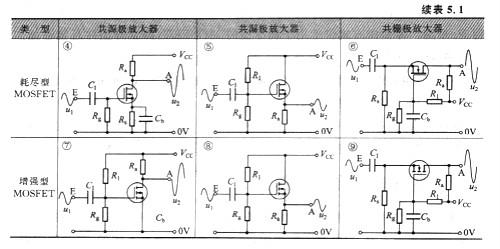 從表中也不難看出,不同組態(tài)的電路,偏置電路也有所不同。表5.1中的①為自偏壓,相似的還有④,自偏壓不適用于增強型器材,由于這類器材的敞開電壓不是從0開端的;②為分膚偏壓,也稱為混合偏壓,是最常用的一種,除了①、④之外均為分壓偏壓方法。