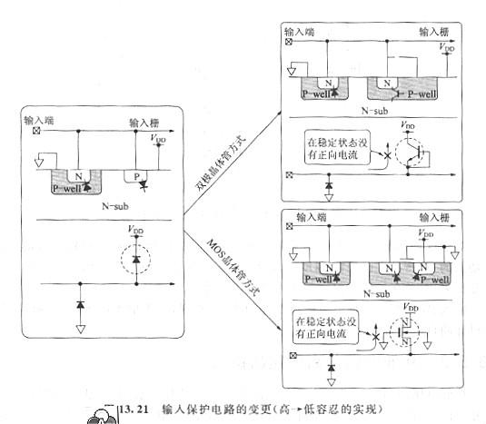 如圖13. 21所示,用晶體管的擊穿特性交流二極管的正向特性,去掉從輸入到VDD線(xiàn)的電流途徑。作為維護(hù)電路,也能夠吸收比VDD線(xiàn)的電壓電平更高的正的外來(lái)浪涌。當(dāng)然,這個(gè)擊穿電壓應(yīng)該設(shè)計(jì)得比IC內(nèi)部的初級(jí)輸入柵耐壓低。