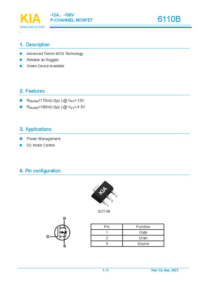 參數: ID(A): -12    BVDSS(V): -100    RDS(ON): 170mΩ    Qg(nC): 19    Package: SOT-89