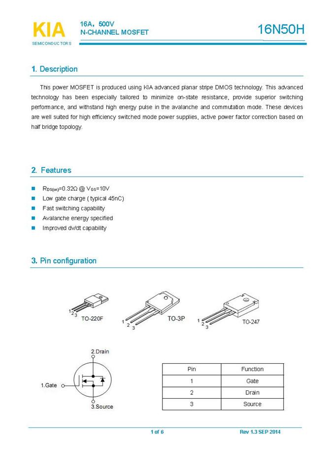 參數: ID(A): 16    BVDSS(V): 500    RDS(ON): 0.38    Qg(nC): 45    Package: TO-220F、TO-3P、TO-247